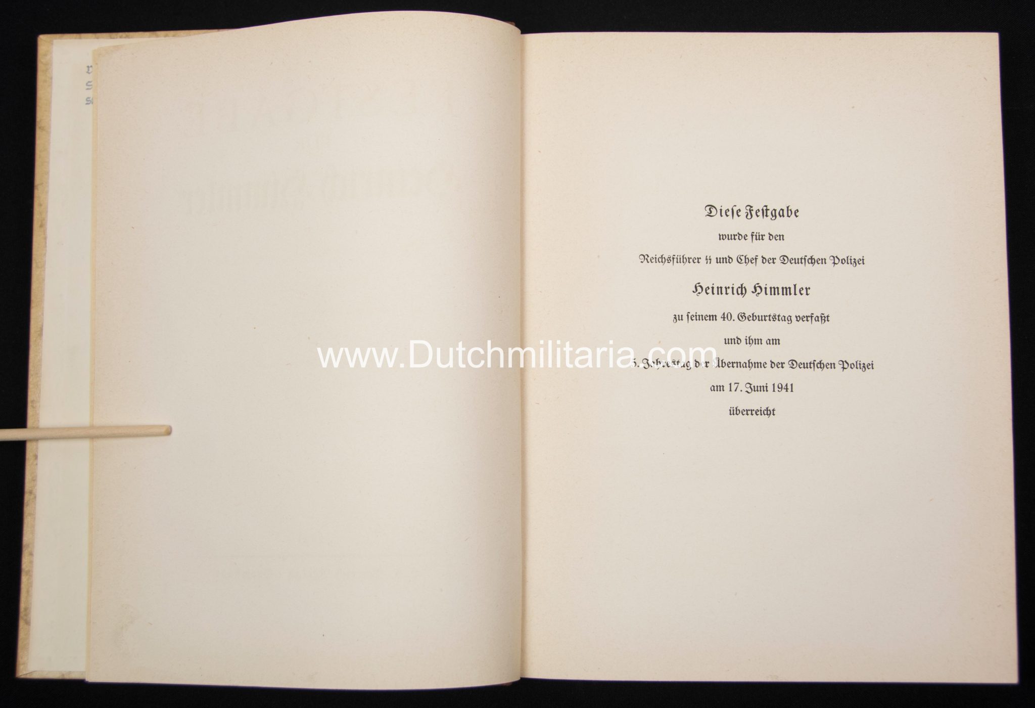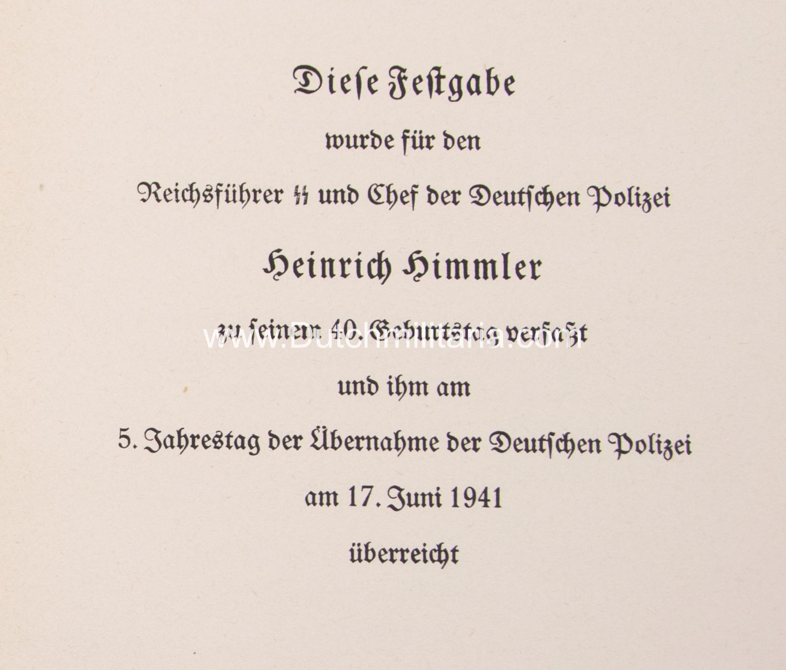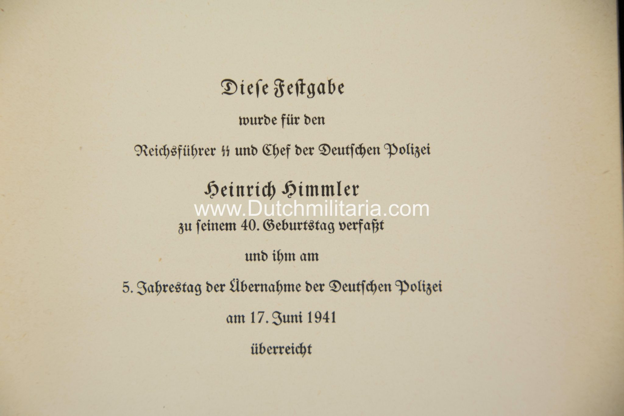 This book “Die Festgabe” [The Ceremony] was especially made on occasion of the 40. Birthday of the Reichsführer SS und Chef der Deutschen Polizei Heinrich Himmler, and was handed to him on the 5. Remembranceday of the German Polizei on 17th June 1941.