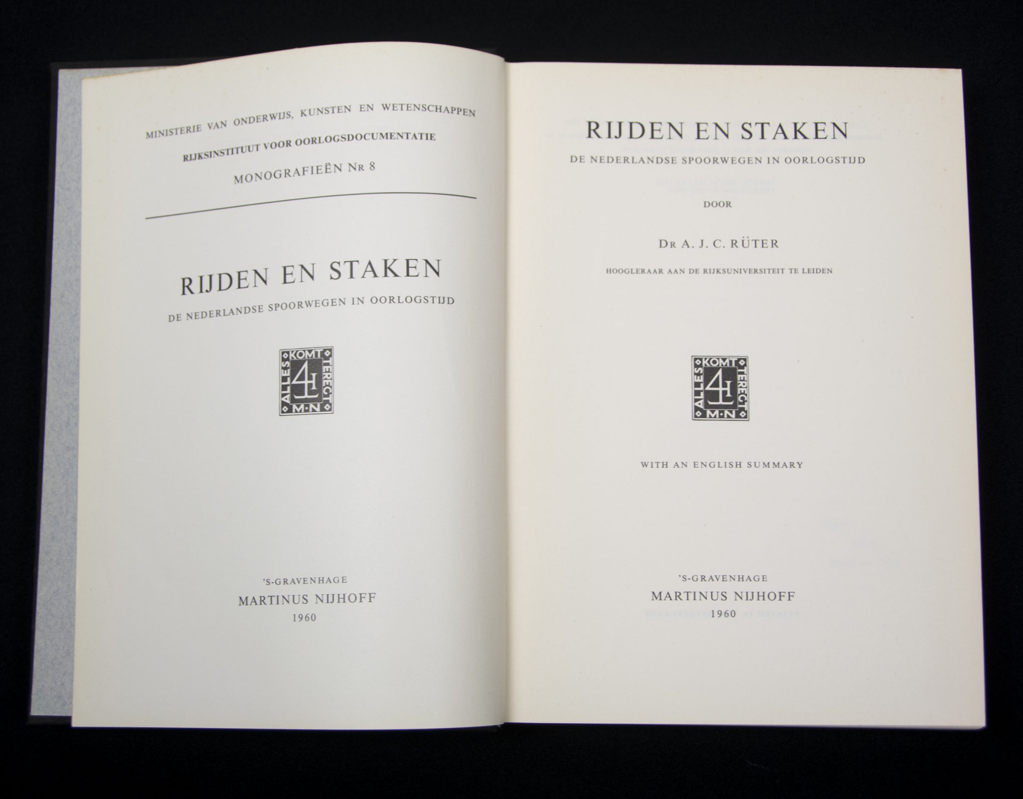 (Book) Dr. A.J.C. Rüter, Rijden en Staken – De Nederlandse spoorwegen in Oorlogstijd 1940-1945, Martinus Nijhoff, ‘s Gravenhage, (1960), full linnen bond.