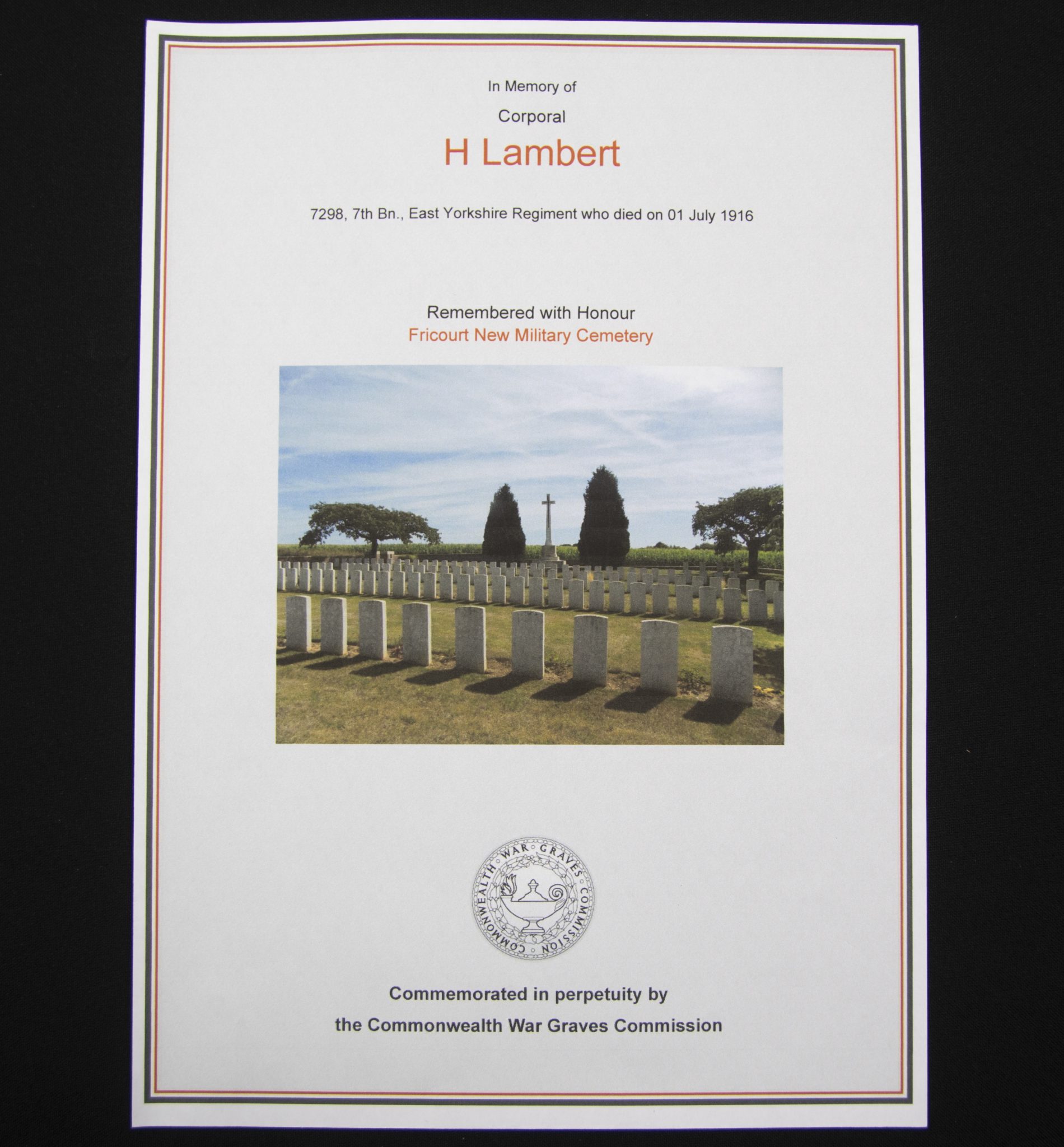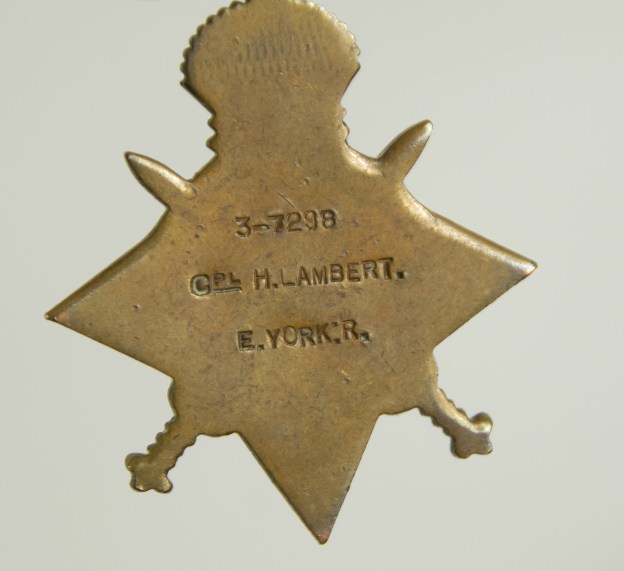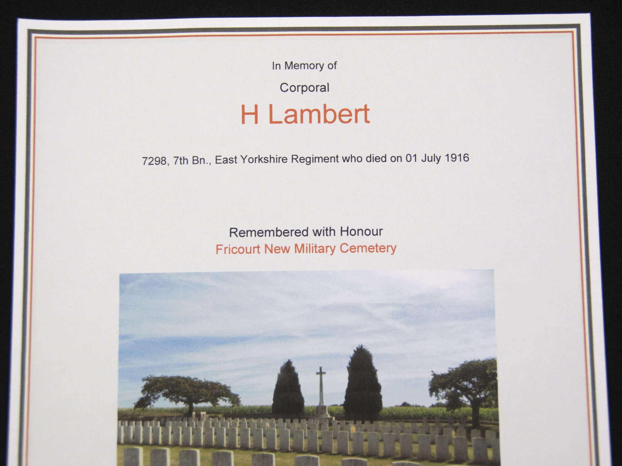 Named to Corporal H. Lambert, service number 7298, 7th Bn., East Yorkshire Regiment