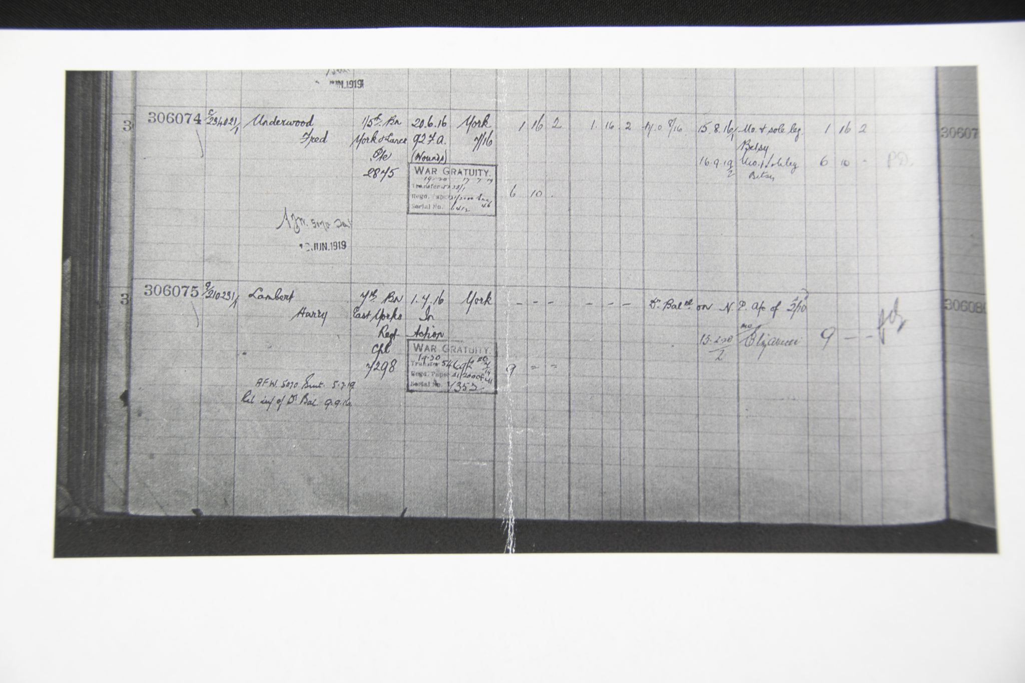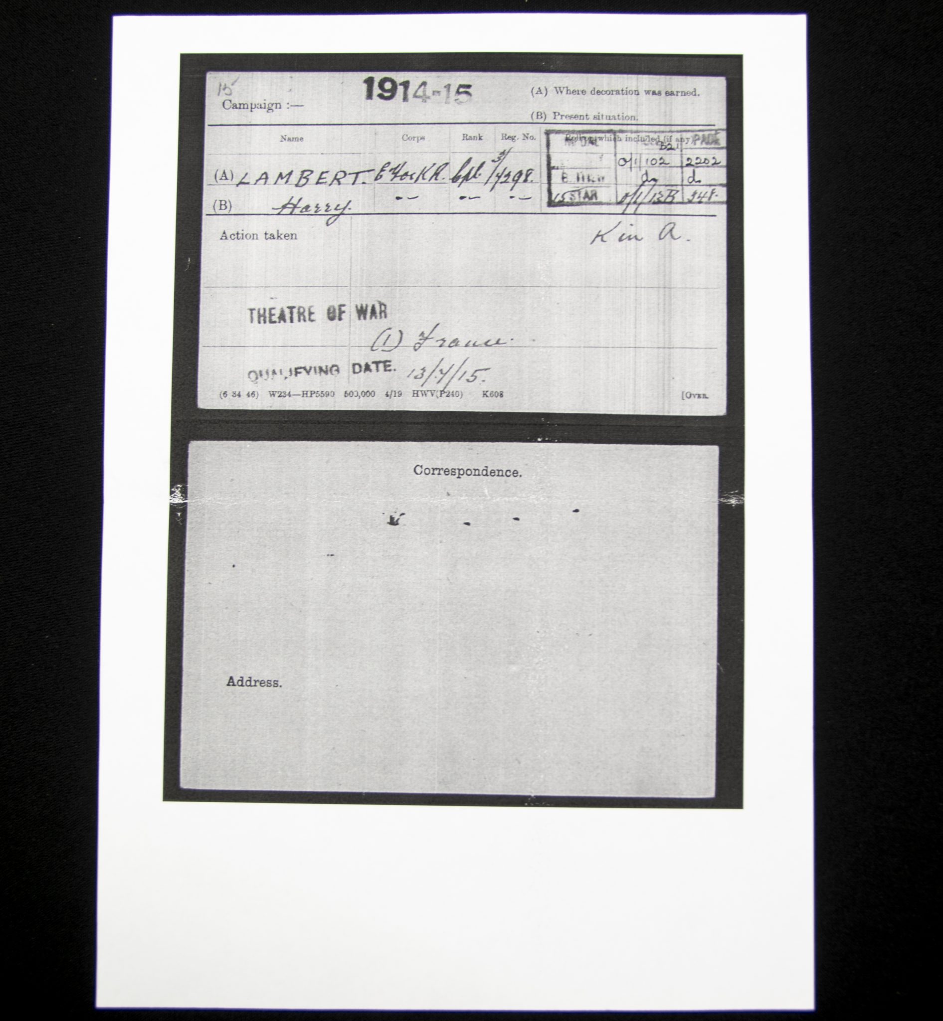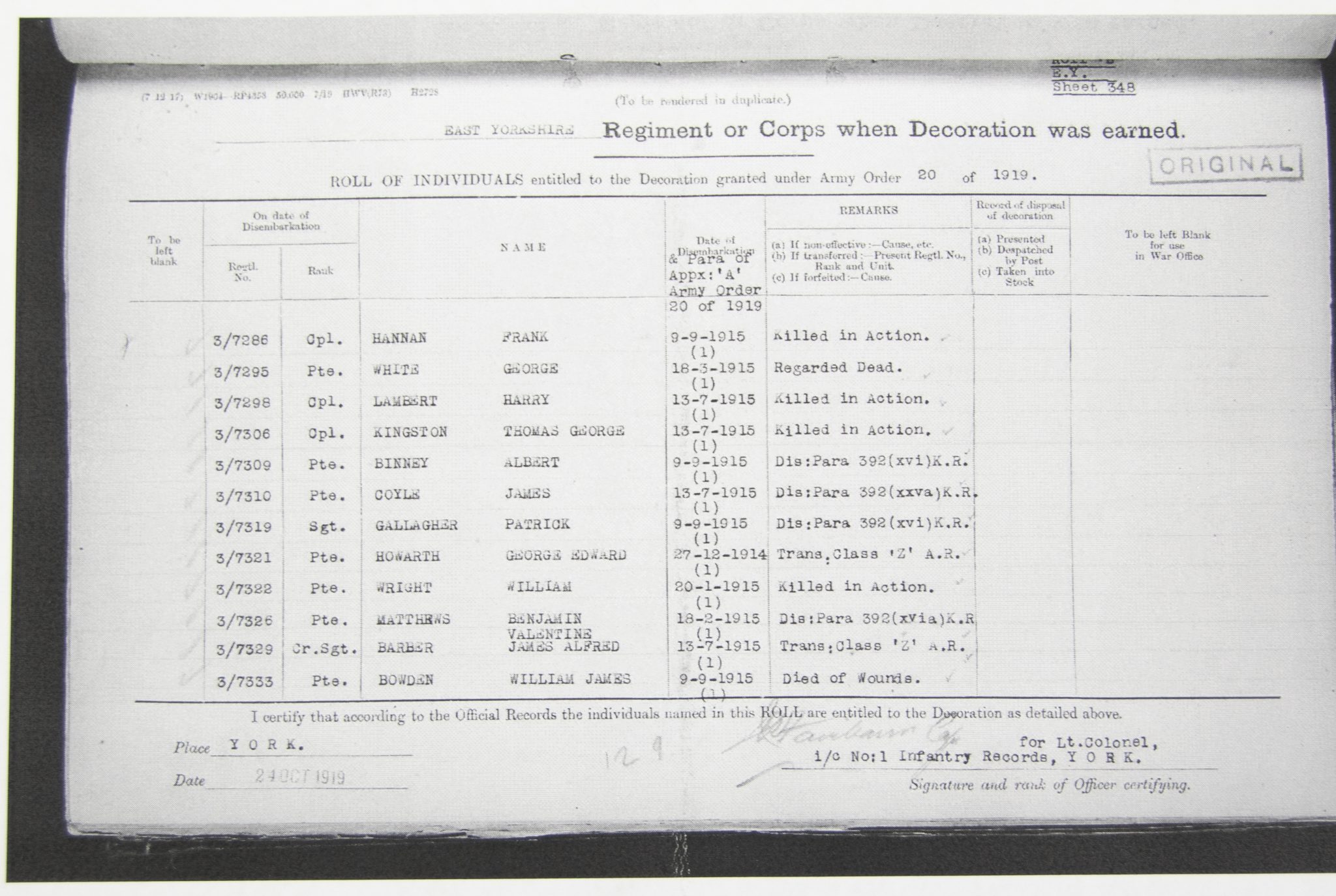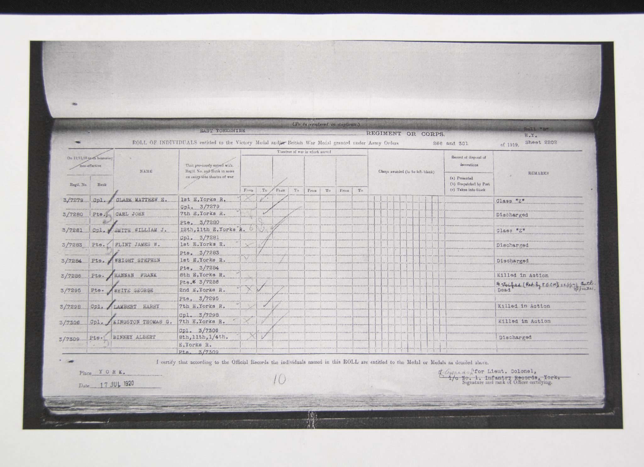 Named to Corporal H. Lambert, service number 7298, 7th Bn., East Yorkshire Regiment