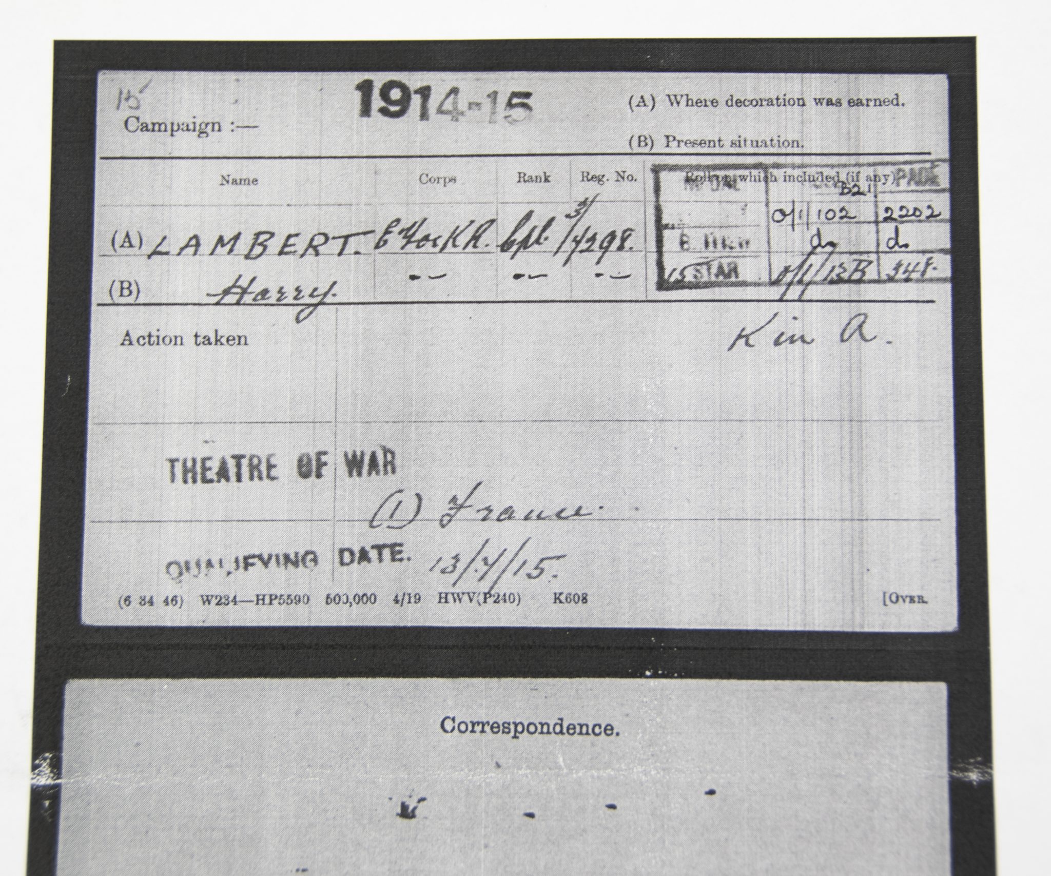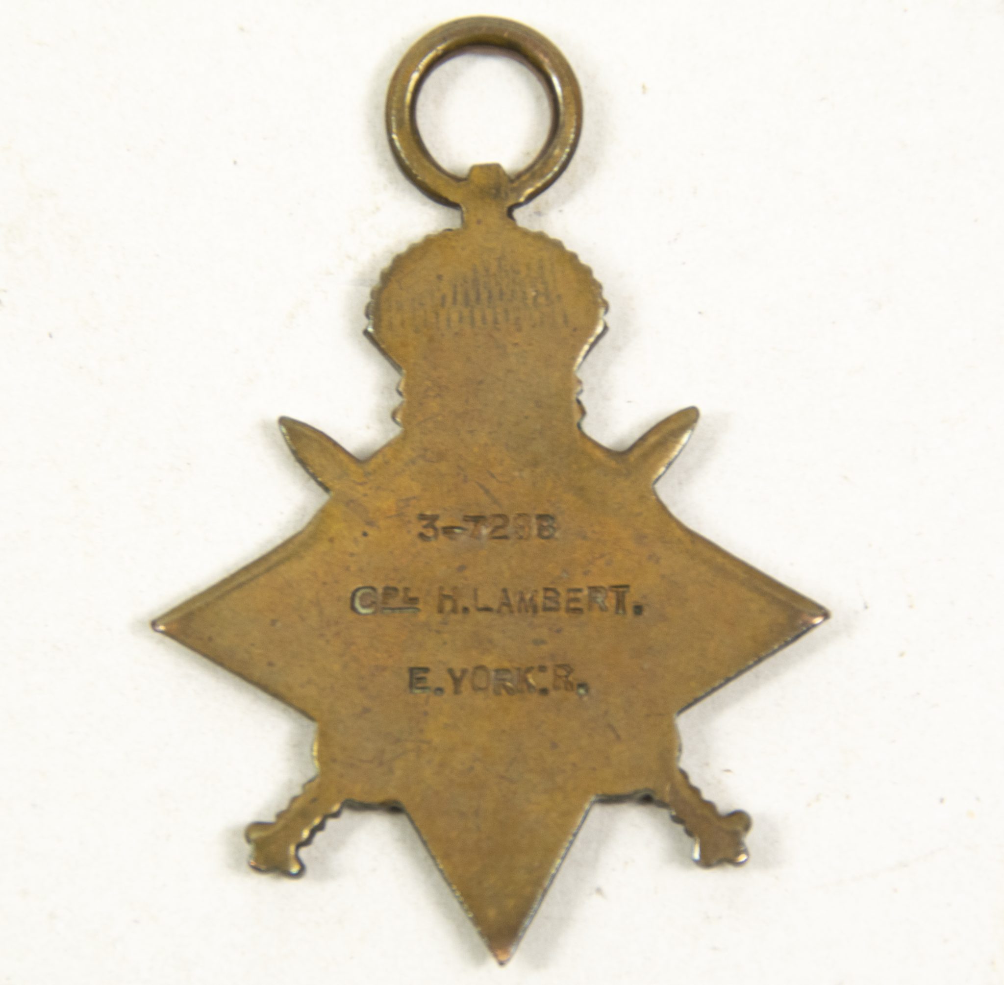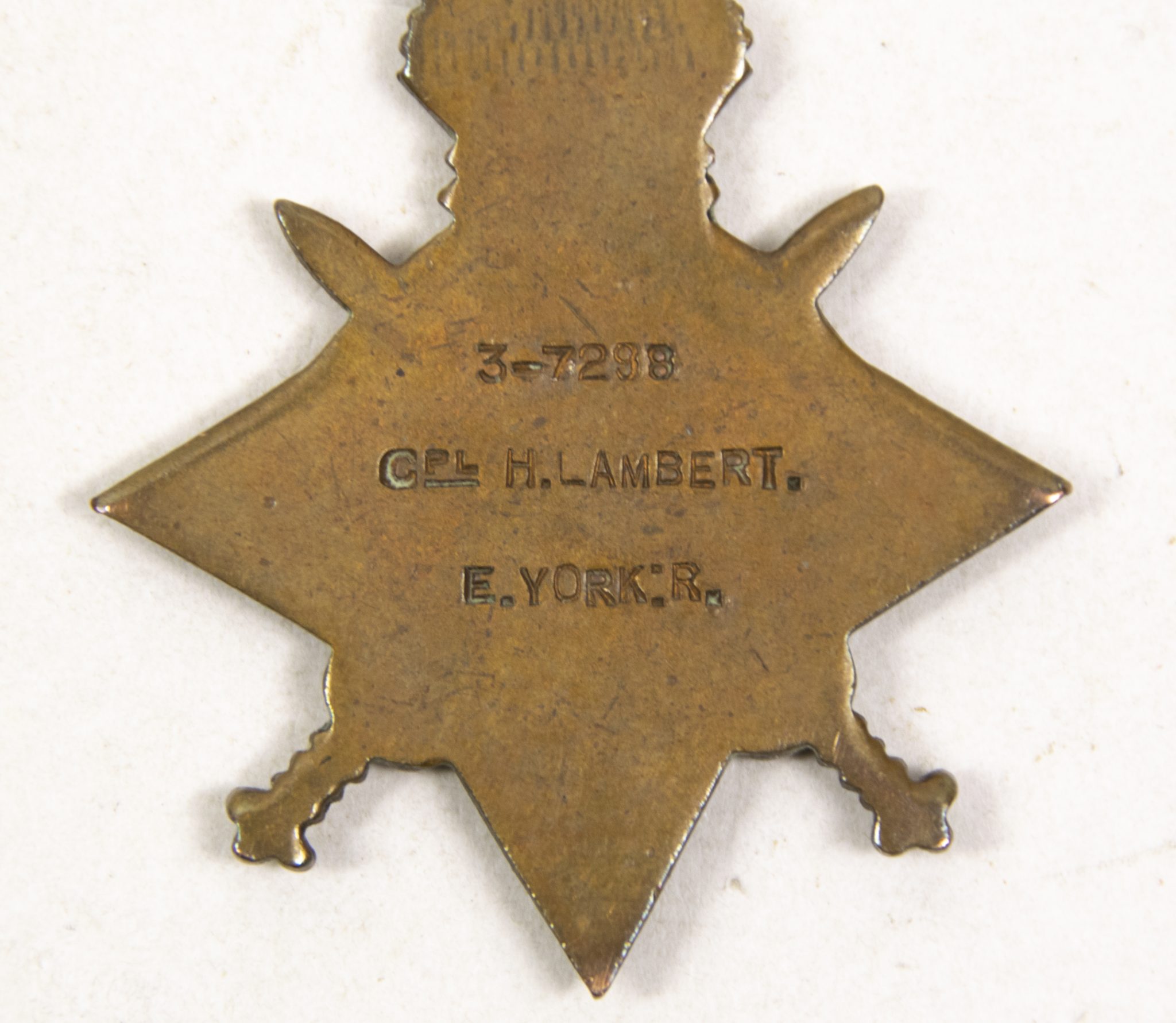 The 1914-15 Star is on the reverse engraved with Cpl H. Lambert, E. York.R. and servicenumber 3-7298.