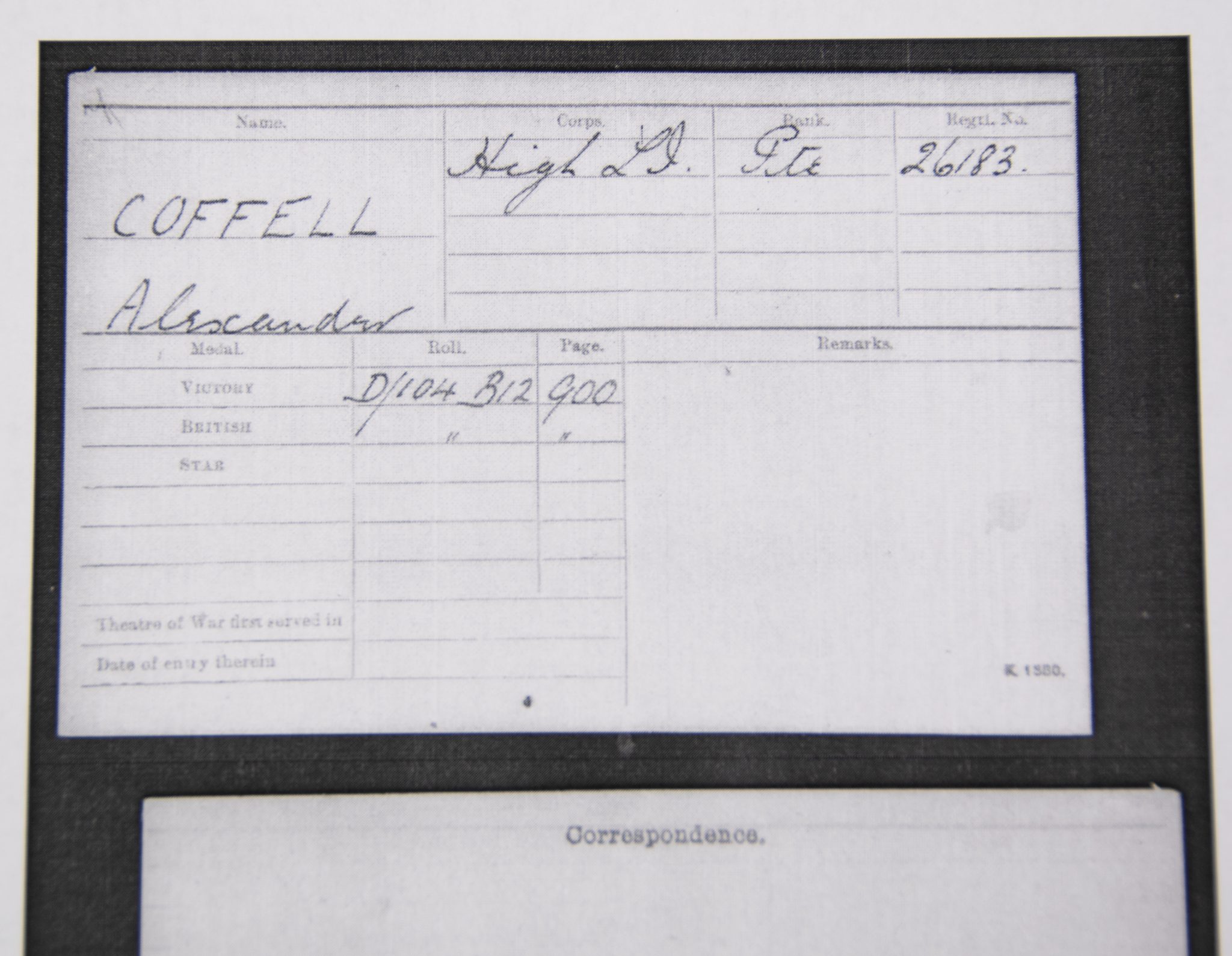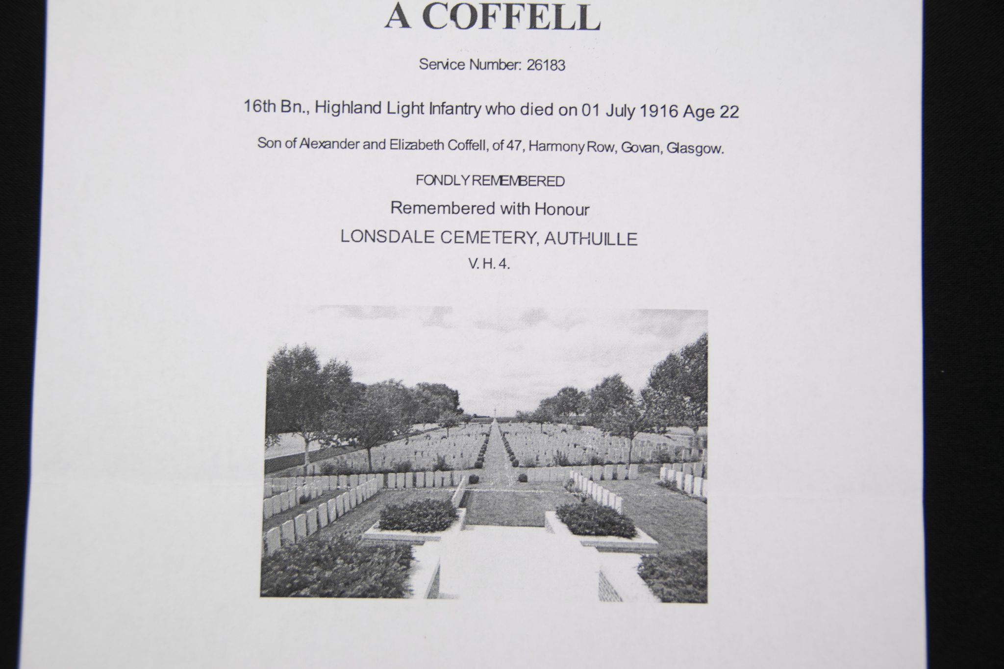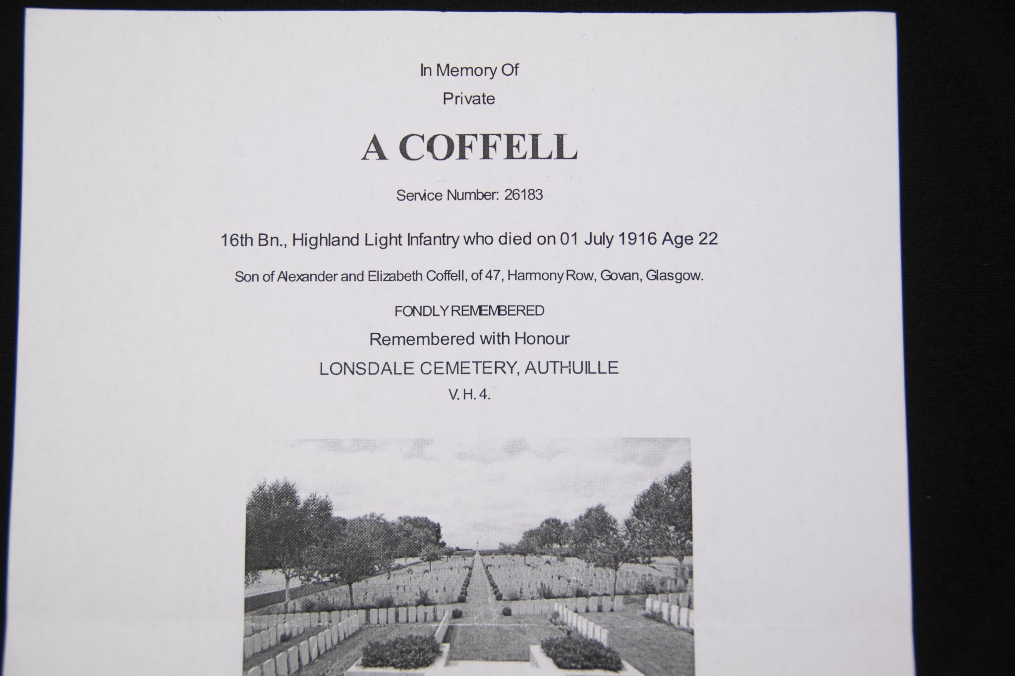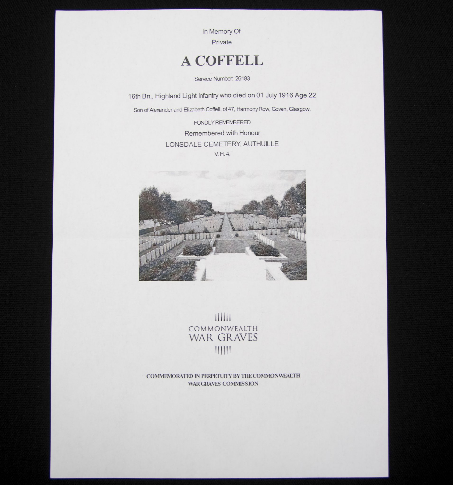 Named to Private Alexander Coffell, service number 26183, 16th Bn., Highland Light Infantry/