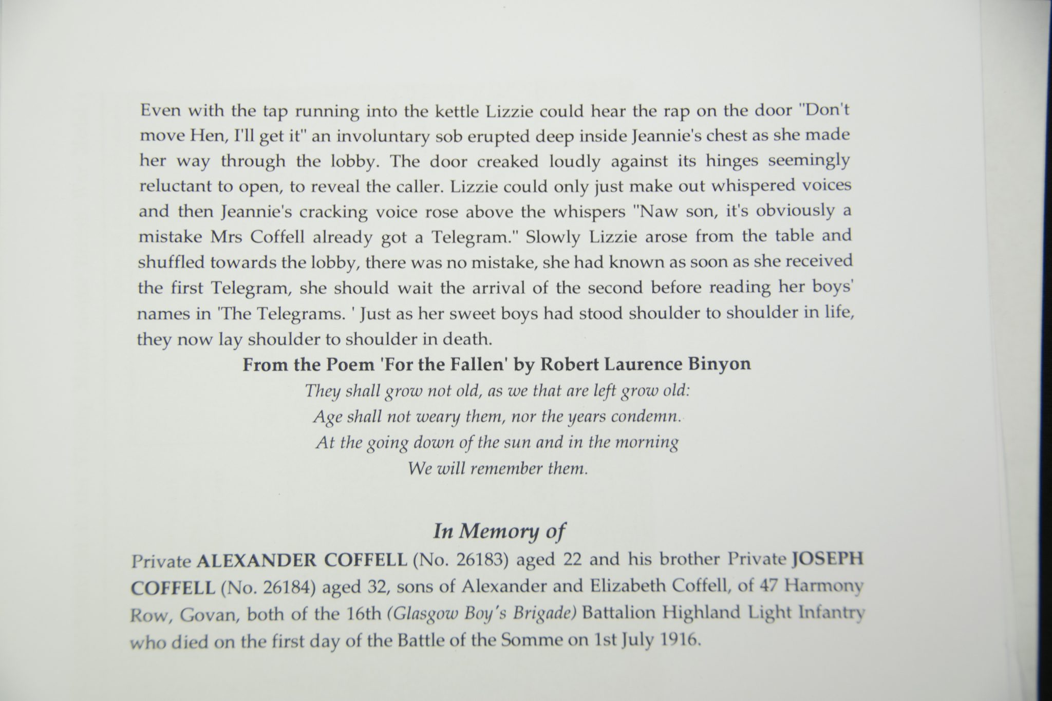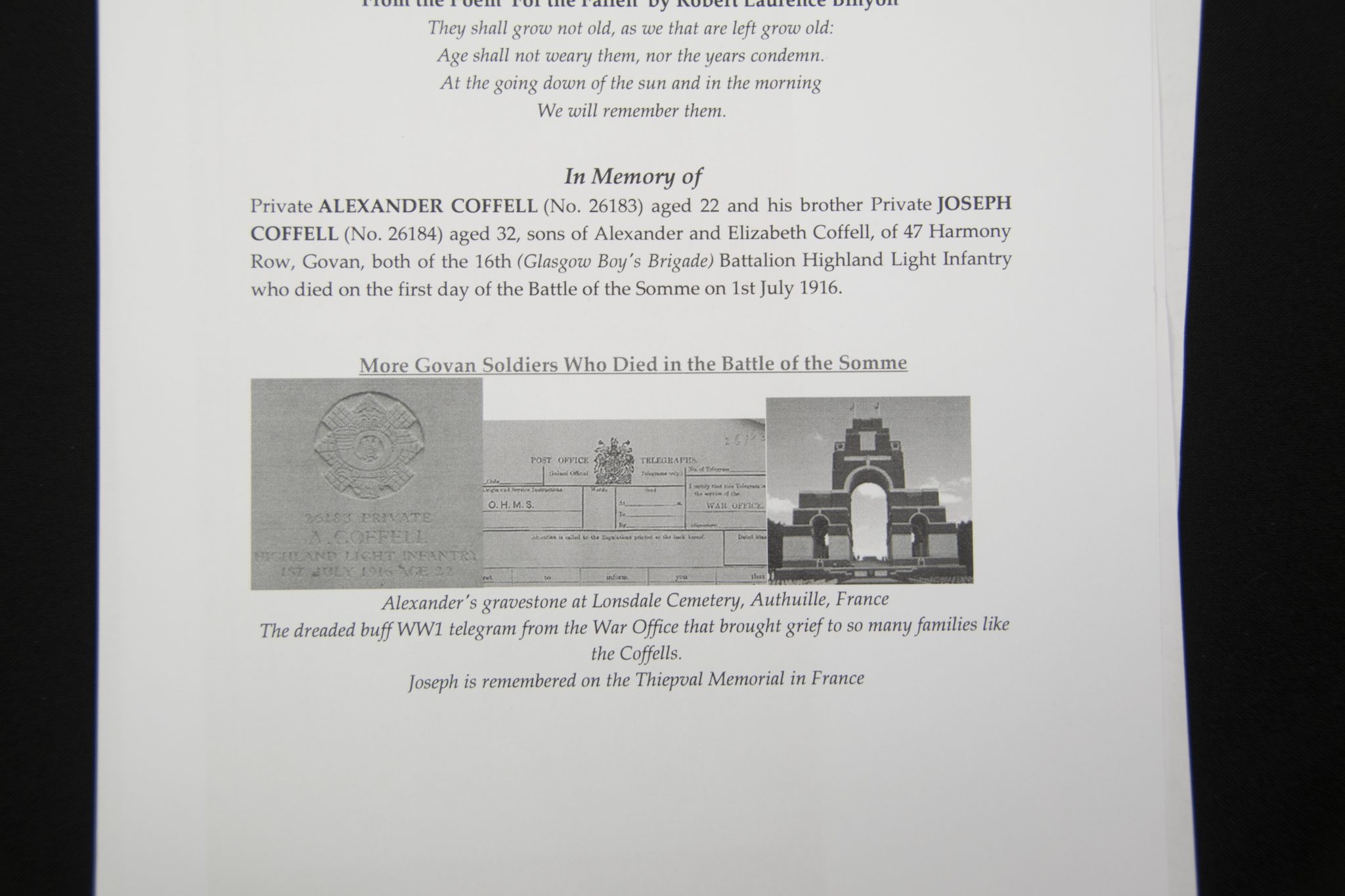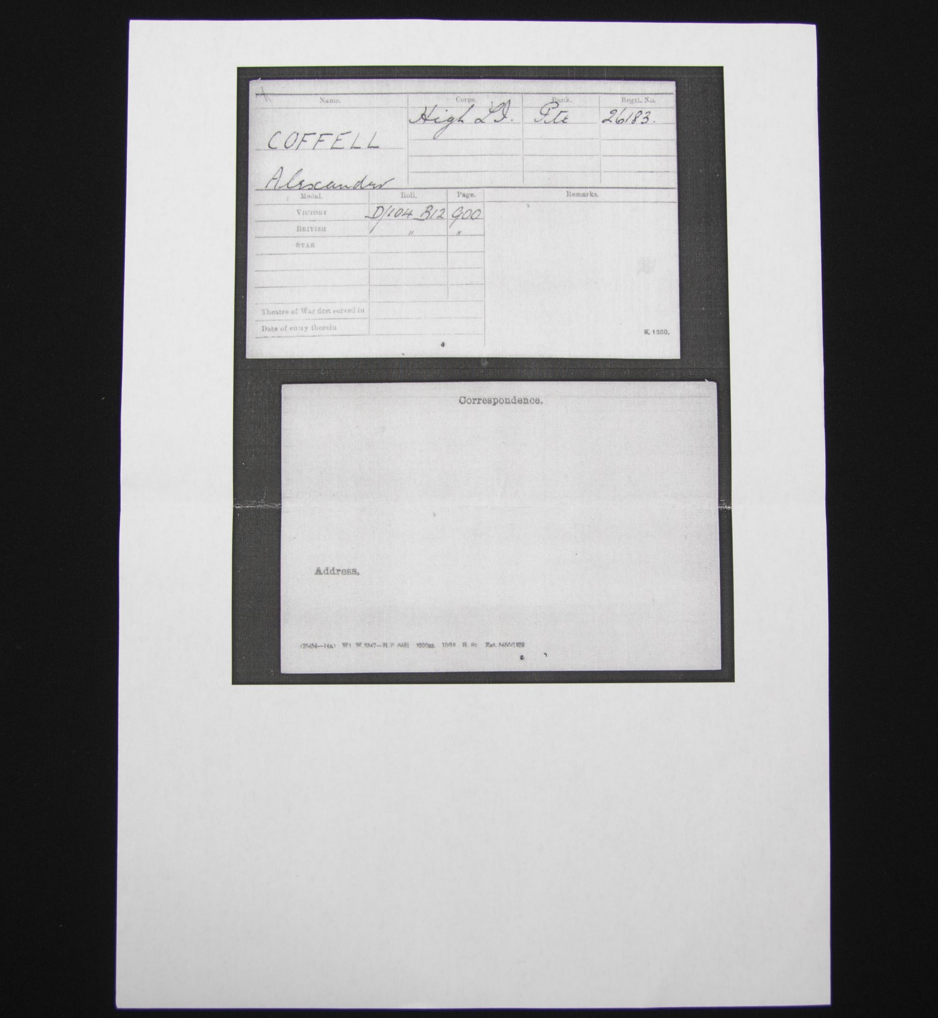 Named to Private Alexander Coffell, service number 26183, 16th Bn., Highland Light Infantry/