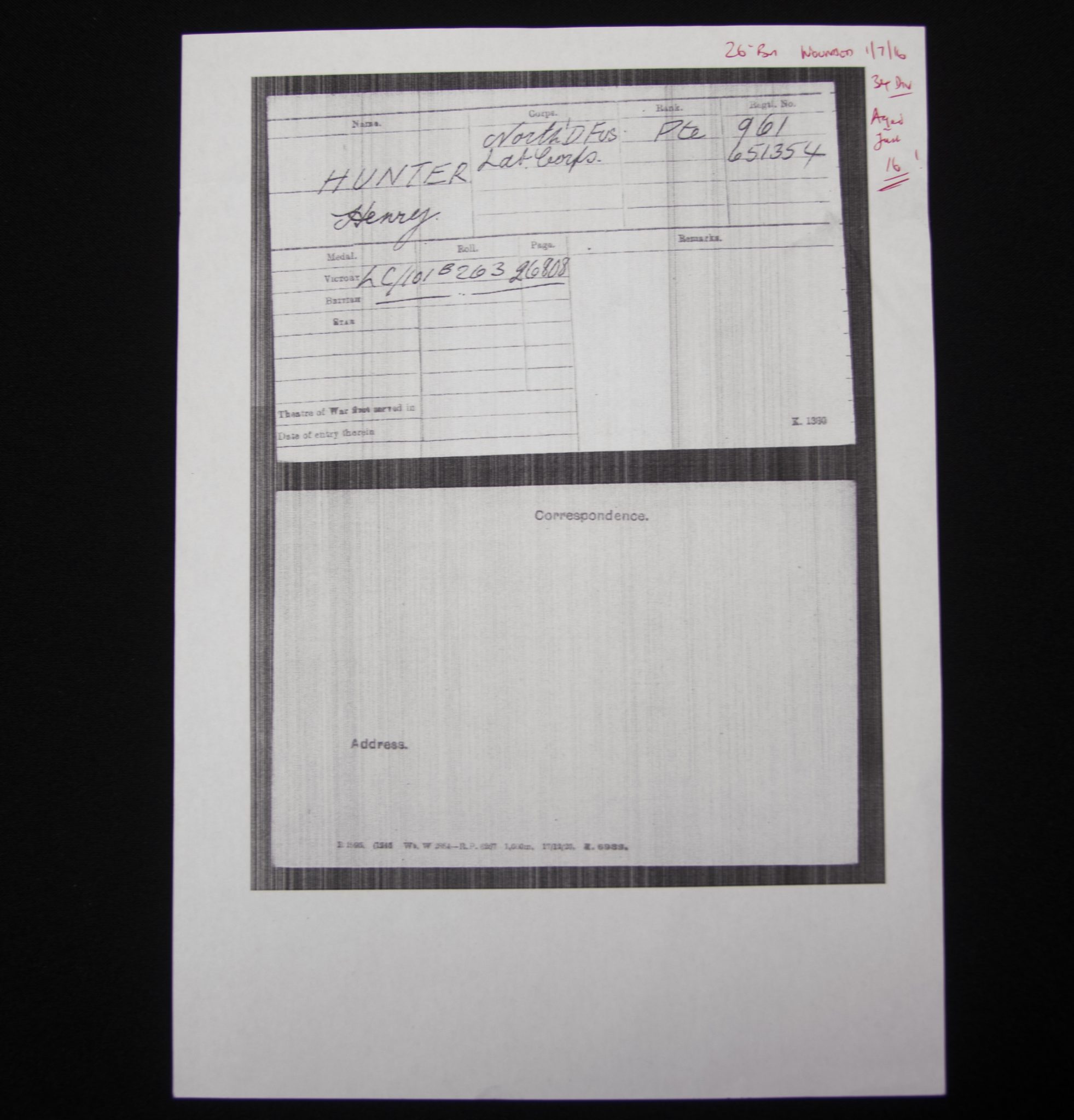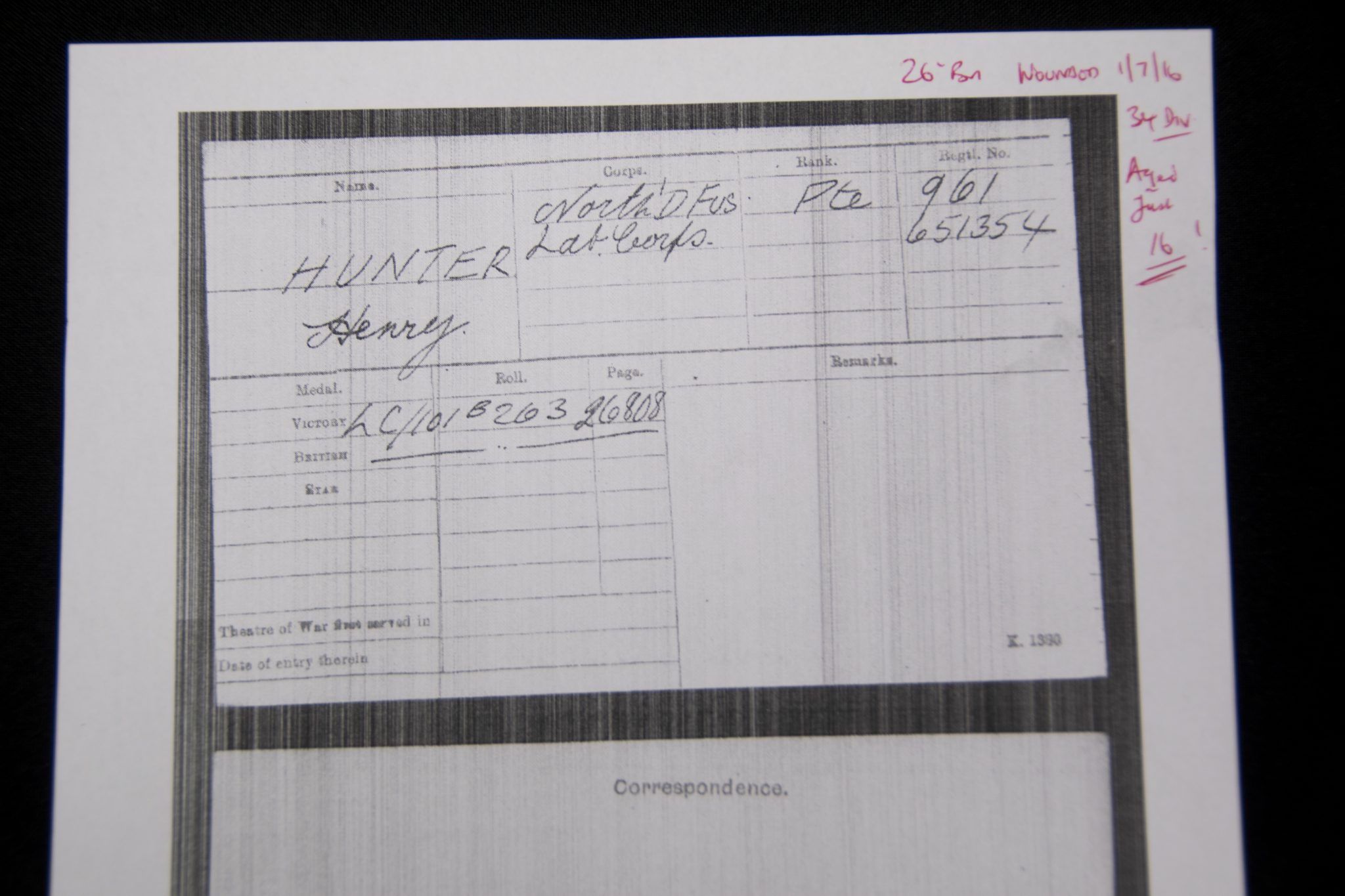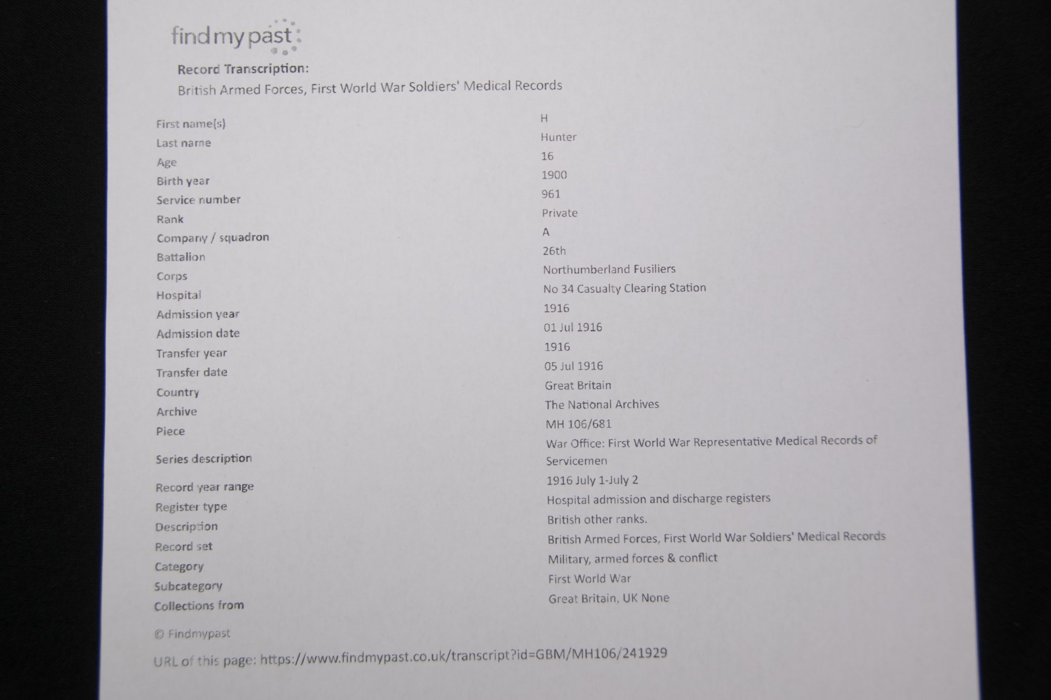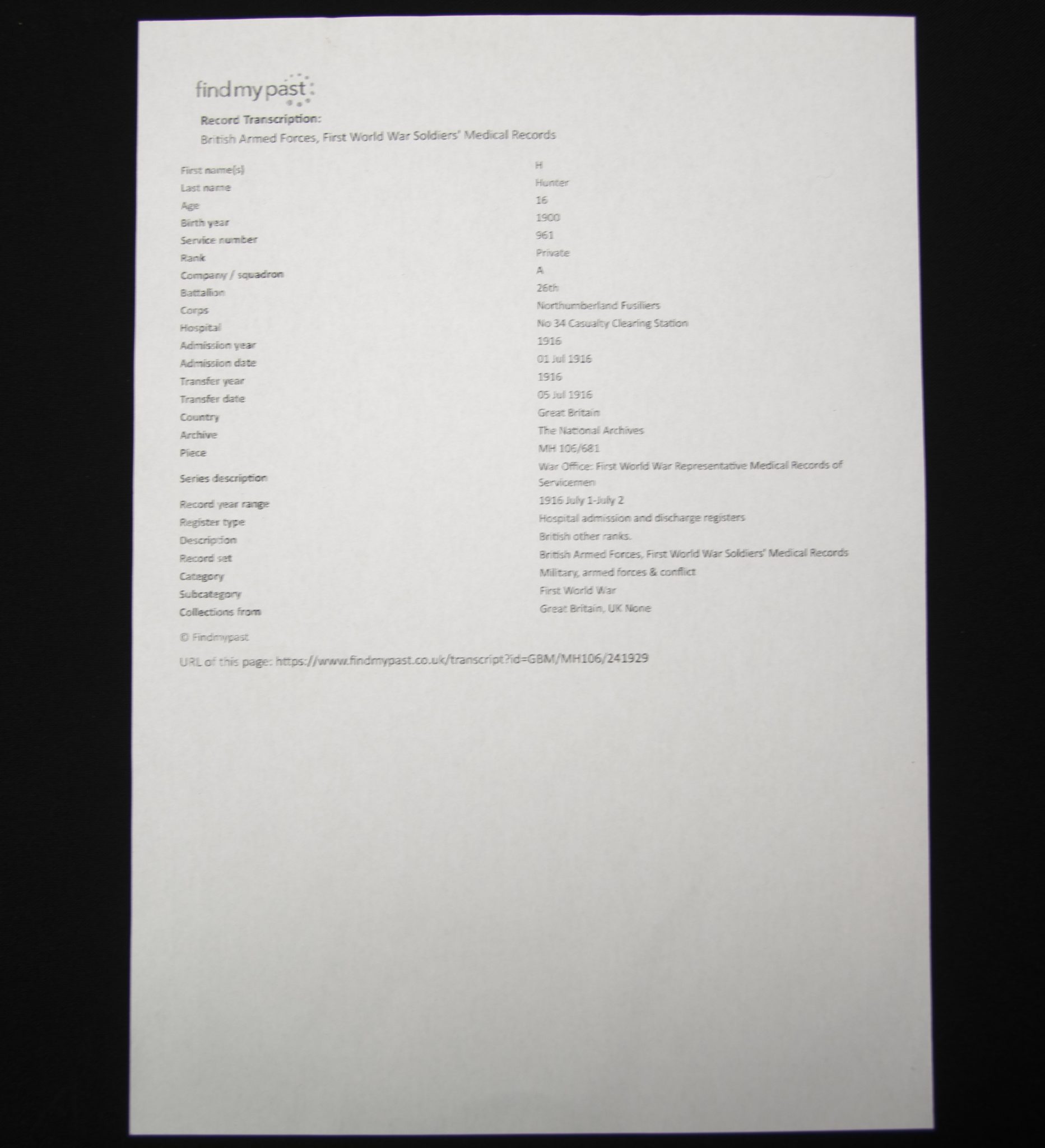 Named to Henry Hunter, who was wounded on his let arm on 1 july 1916 during the First day of the Somme Battle. He was at this time only 16 years old (!). He was sent to No.34 Casualty Clearing Station Hospital.