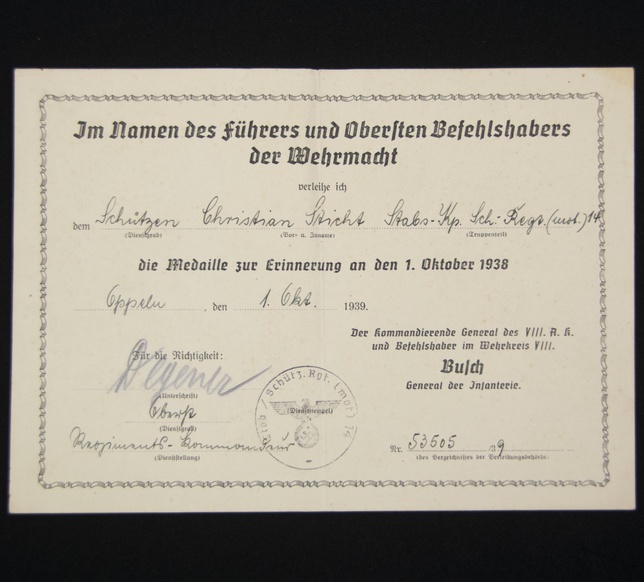 Category: Passes, Documents and Citations Tag: (Citation) Die Medaille zur Erinnerung an den 1. Oktber 1938
