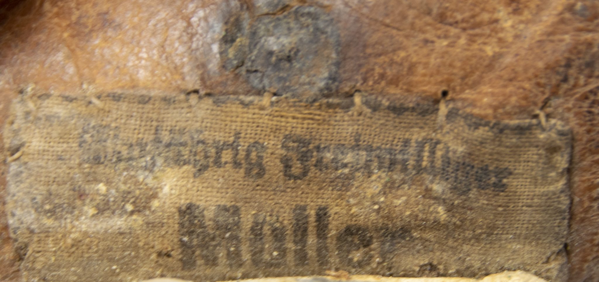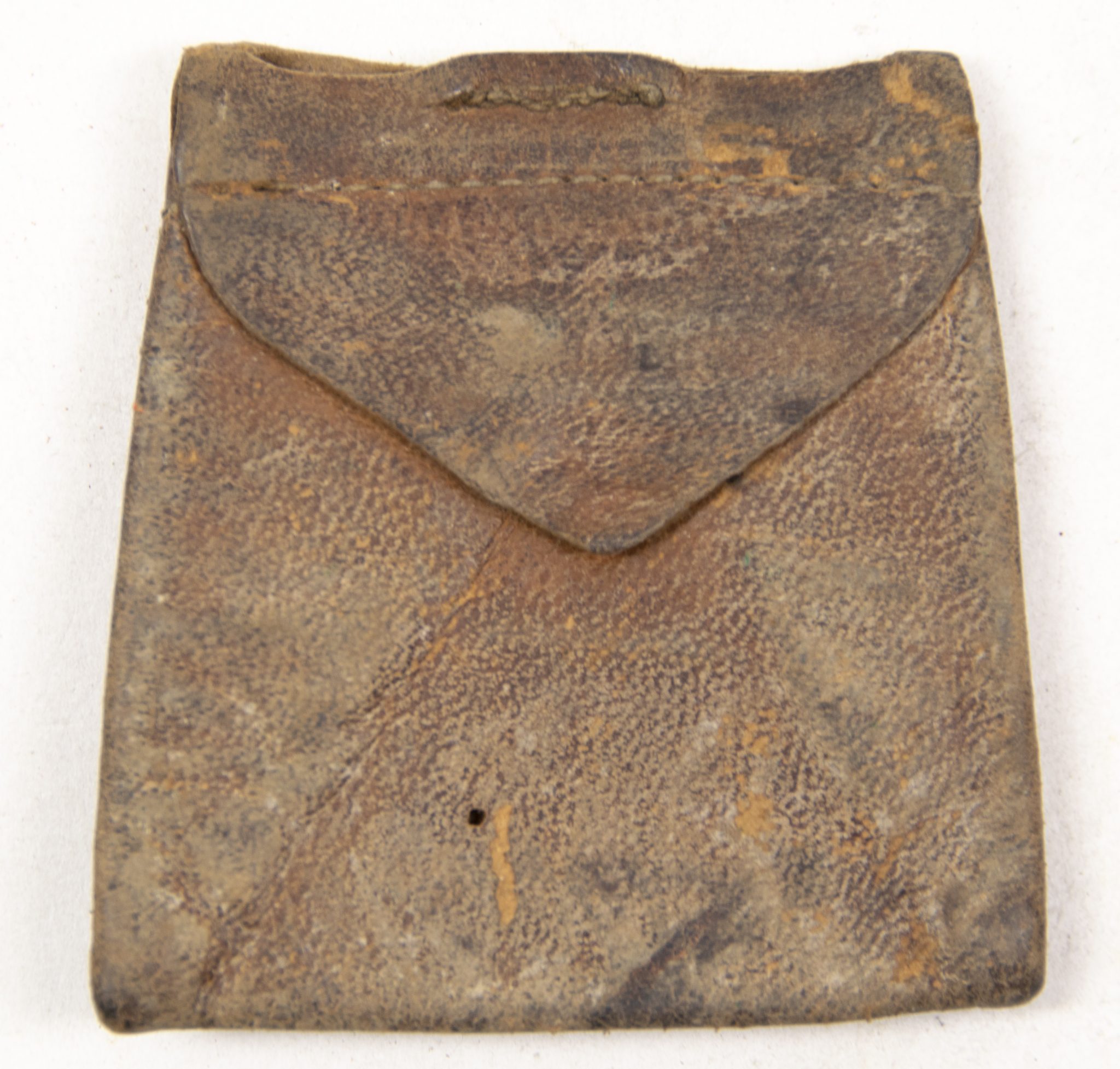 In heavy used condition, in original leather carrying bad. The Erkennungsmarke is affixed to the bacg, and behing it is a cloth nametag, named to: Freiwilliger Müller.