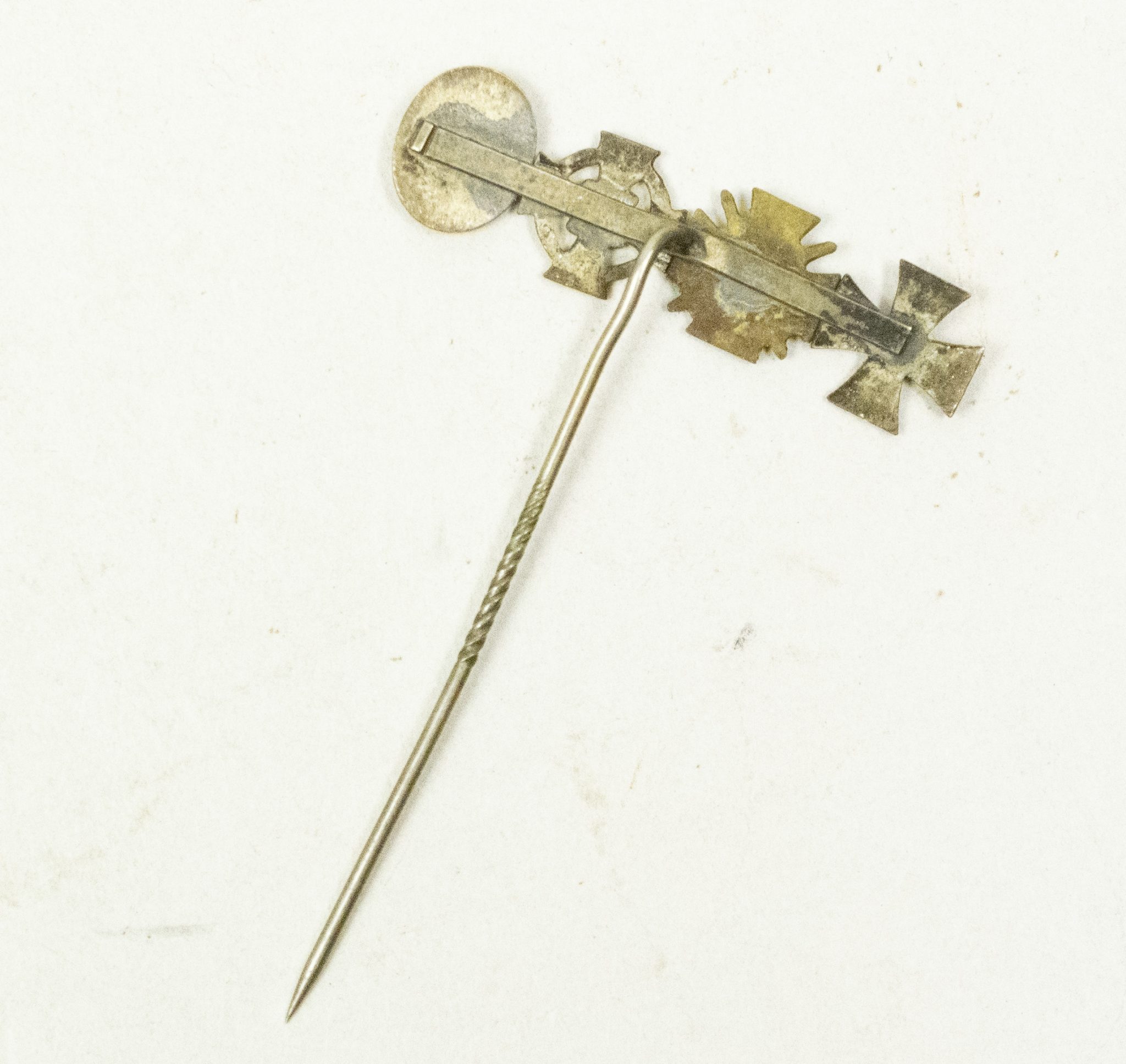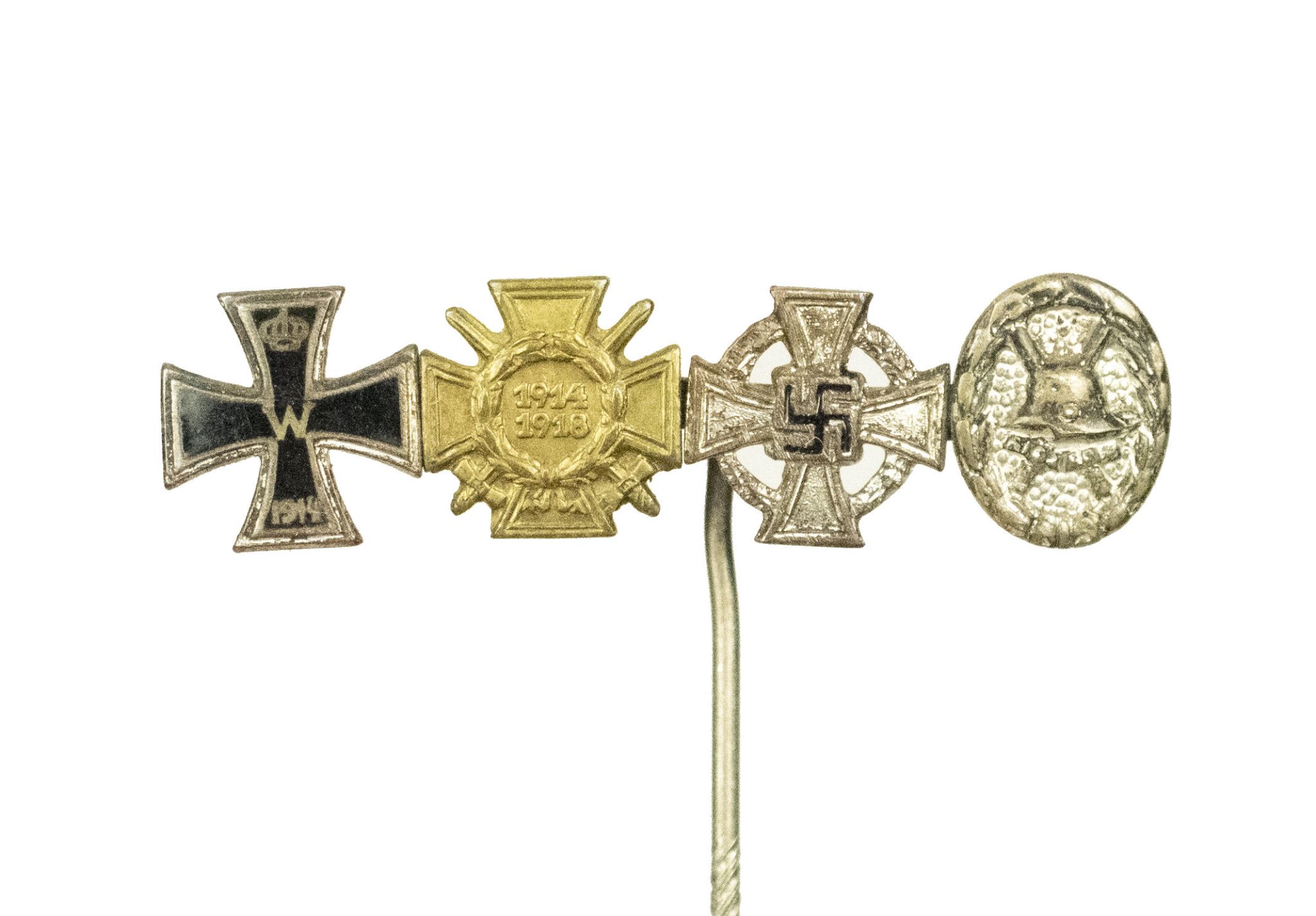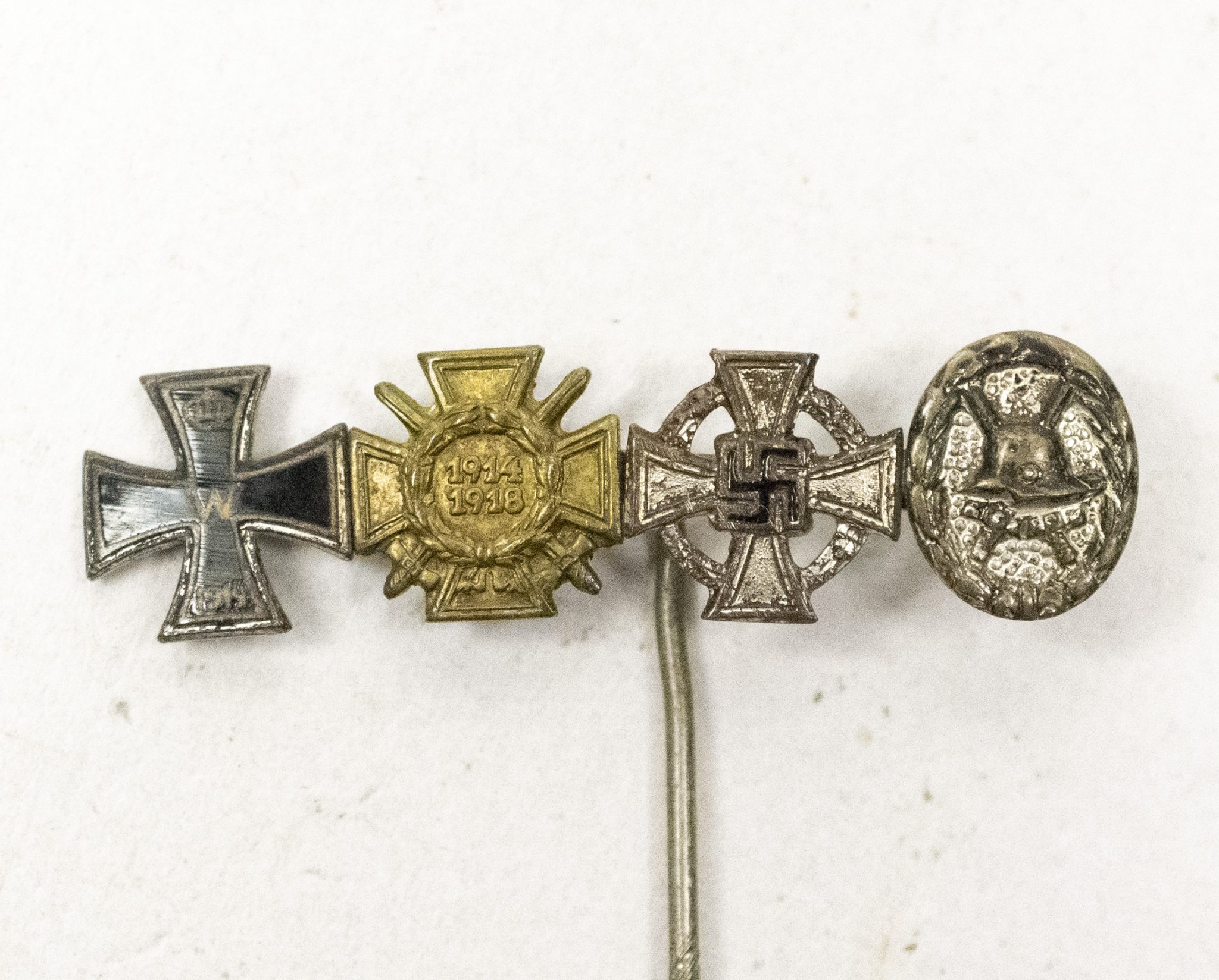 German stickpin with EK2 + Frontkämpfer Ehrenkreuz + Treue Dienste 25 jahre + Verwundetenabzeichen silber.