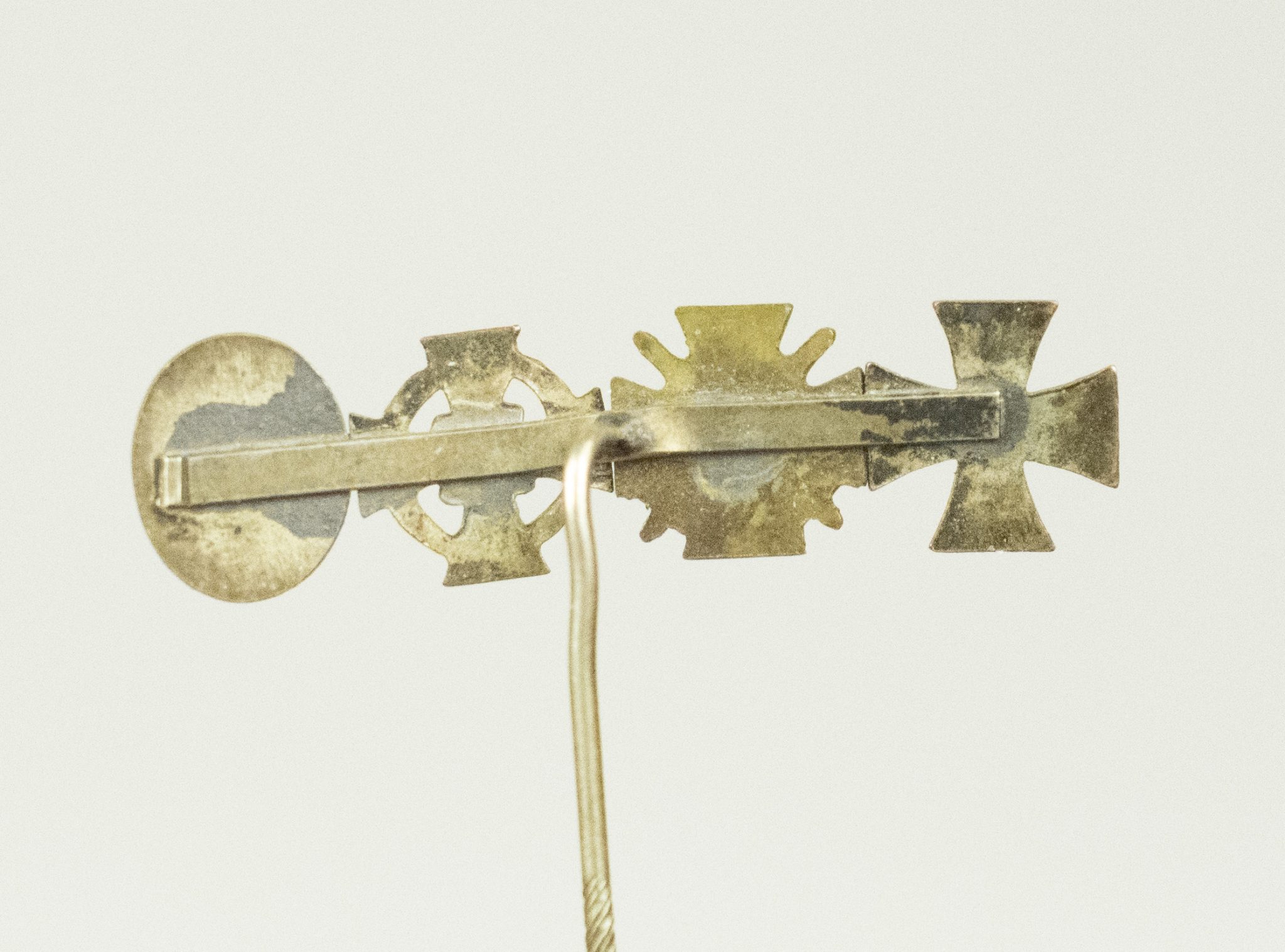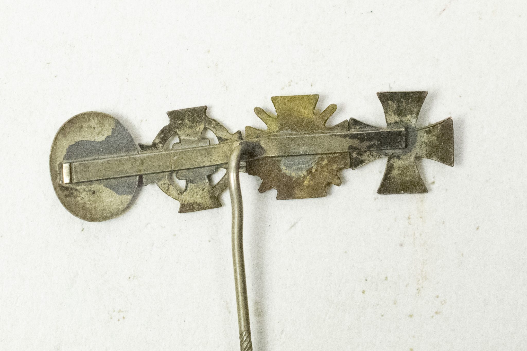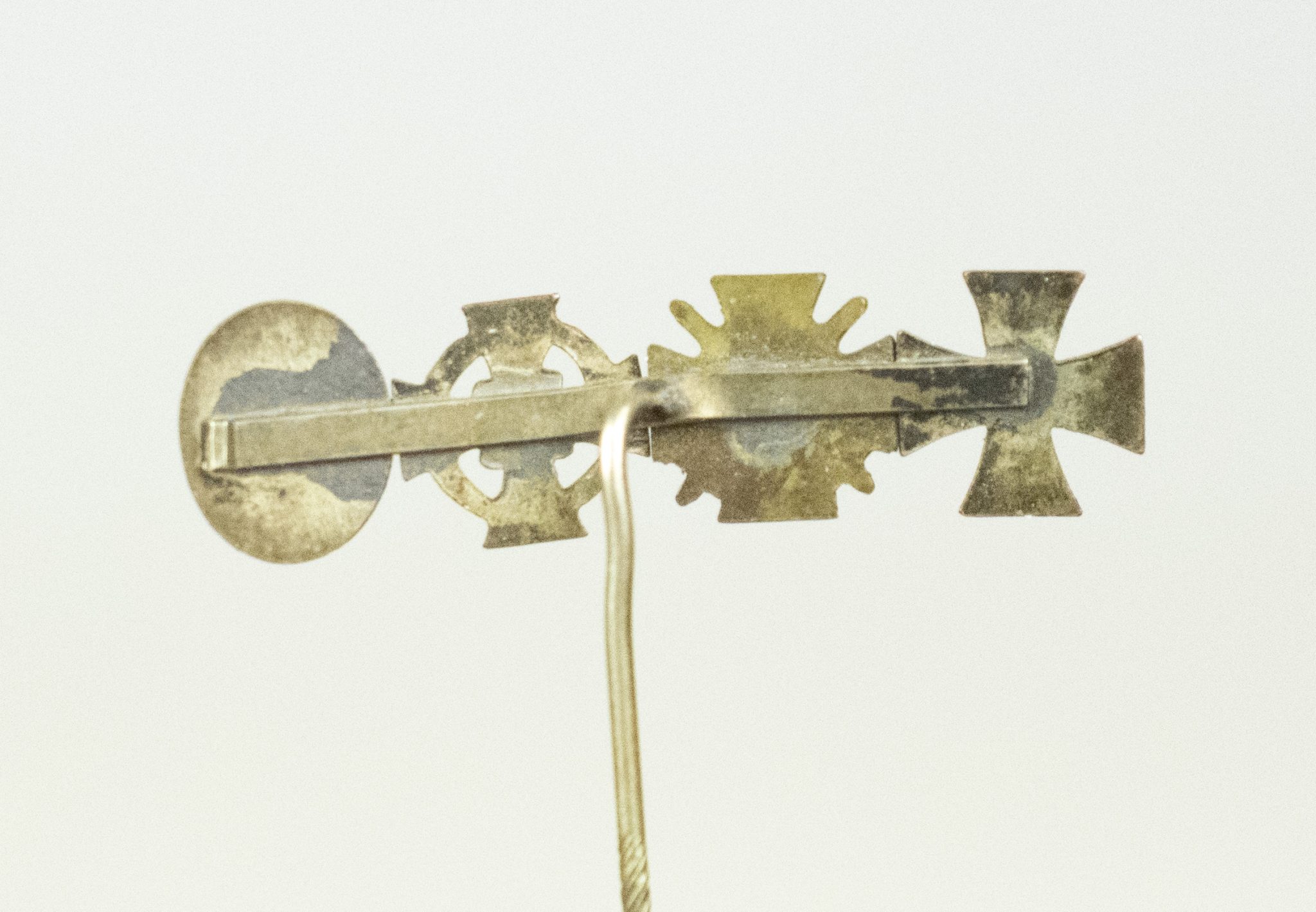 German stickpin with EK2 + Frontkämpfer Ehrenkreuz + Treue Dienste 25 jahre + Verwundetenabzeichen silber.