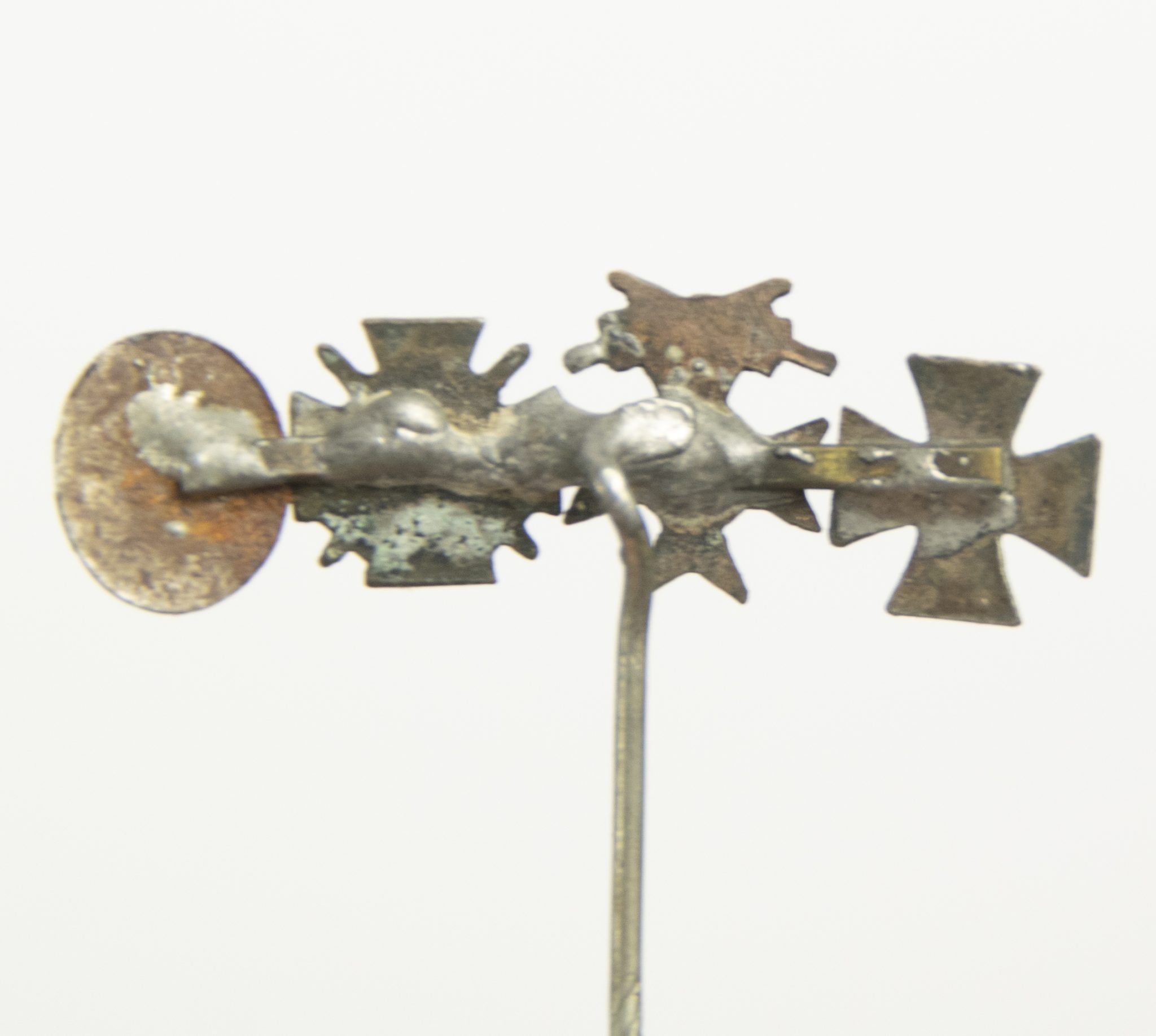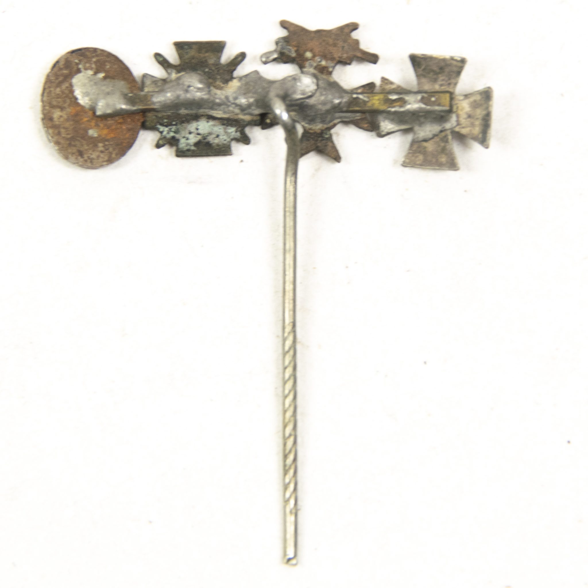 German WWI lapel stickpin with EK2 + Bavarian Merit cross + Frontkämpfer Ehrenkreuz + Black woundbadge.