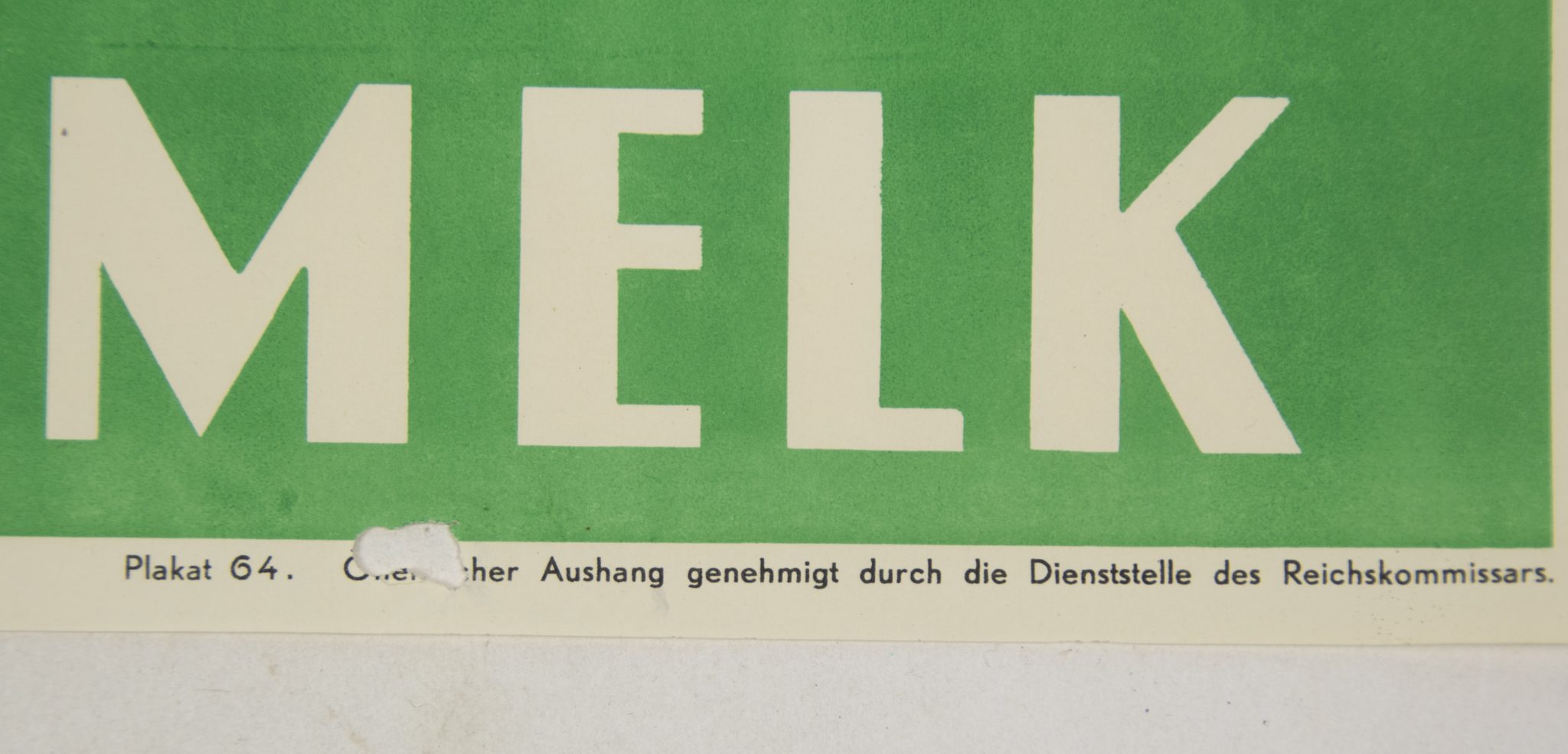 A very rare, albeit not so sexy” wartime German approved poster that hung in the Netherlands, the design with a milkdrinking cow (???) is rather sily, but it is nevertheless a rare poster that never surfaces.